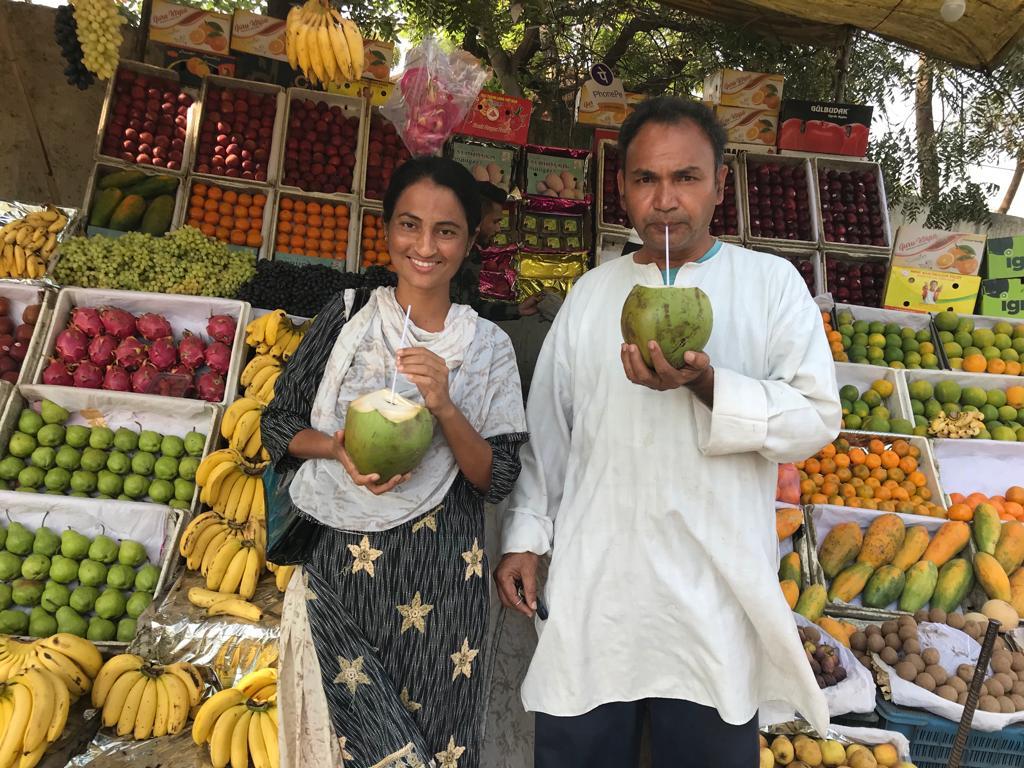 Auf dem Rückweg kaufen wir Obst und löschen unseren Durst mit frischem Kokoswasser.